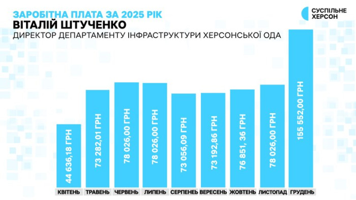 Віталій Штученко департамент інфраструктури Херсонської ОДА очолив у квітні 2025 року й за дев'ять місяців роботи на цій посаді зробив 730 тисяч 648 тисяч гривень. Найбільше він отримав у грудні — 155 тисяч 552 гривні, з урахуванням 77 526 премії за щорічне оцінювання.