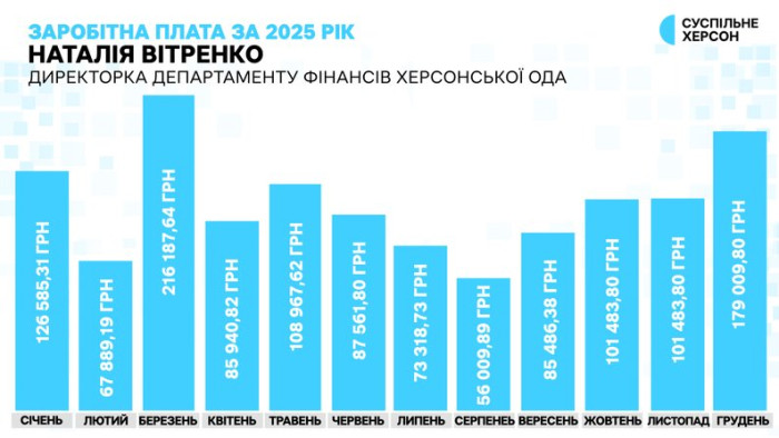 Заробітна плата директорки департаменту фінансів Херсонської ОДА Наталії Вітренко за 2025 рік помісячно. Інфографіка Суспільне Херсон