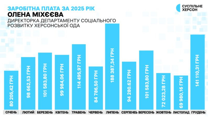 Заробітна плата директорки департаменту соціального розвитку Херсонської ОДА Олени Міхєєвої за 2025 рік помісячно. Інфографіка Суспільне Херсон