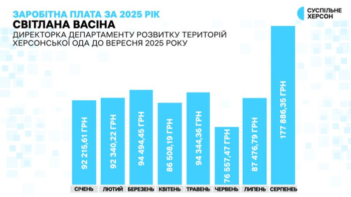 Заробітна плата колишньої директорки департаменту розвитку територій Херсонської ОДА Світлани Васіної за 2025 рік помісячно. Інфографіка Суспільне Херсон