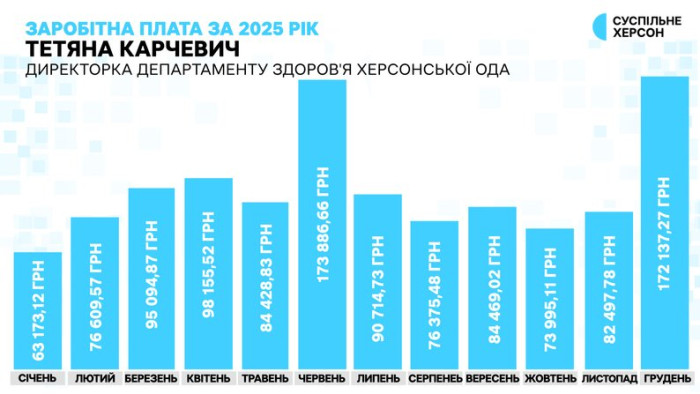 У 2025 році директорка департаменту здоров'я Херсонської ОДА Тетяна Карчевич заробила мільйон 171 тисячу гривень. Найбільшою її зарплата була у червні — майже 174 тисячі гривень, з них 90 тисяч 530 гривень вона отримала як матеріальну допомогу на відпустку. Наприкінці року чиновниця отримала премія за щорічне оцінювання роботи — 77 тисяч 526 грн.