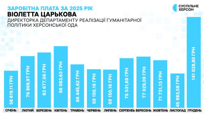 Заробітна плата директорки департаменту реалізації гуманітарної політики Херсонської ОДА Віолетти Царькової за 2025 рік помісячно. Інфографіка Суспільне Херсон