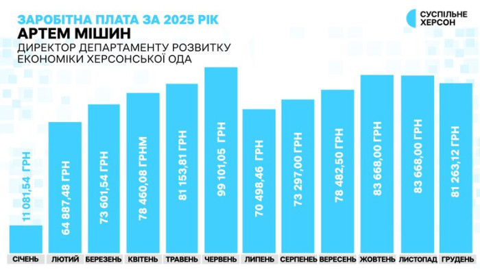 Заробітна плата директора департаменту розвитку економіки Херсонської ОДА Артема Мішина за 2025 рік помісячно. Інфографіка Суспільне Херсон