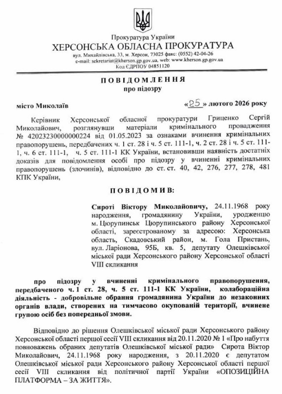Перша сторінка повідомлення про нову підозру зраднику Віктору Сироті. Фото: kherson.gp.gov.ua
