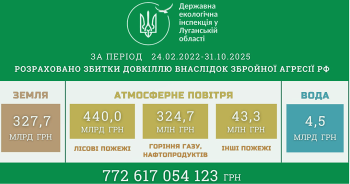 «Щоденні бойові дії на території Луганської області призводять до масштабного руйнування природного середовища. Станом на 31 жовтня 2025 року фахівцями Державної екологічної інспекції у Луганській області зафіксовано та розраховано збитків довкіллю на загальну суму 772 617 054 123 грн», — ідеться в повідомленні.
